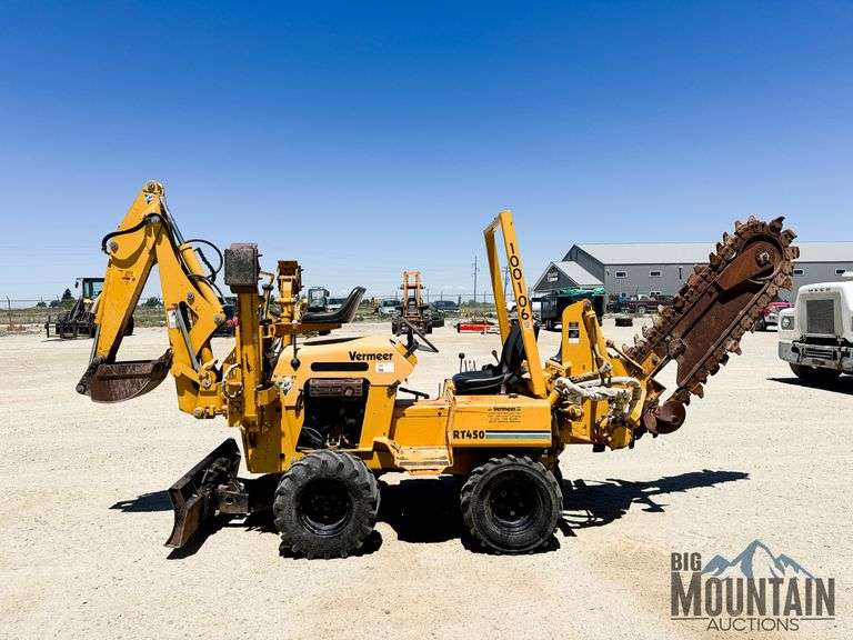 Vermeer RT450 Trencher Backhoe, Showing 1852 Hrs, 26x12:00 Tires, Front 54" Leveling Blade, SN:1VRX0721451000596/Rear S0450 Trencher, SN:1VRX080VX51000386, B450 Front Backhoe, 12" Digging Bucket, SN:1VRZ060E551000311