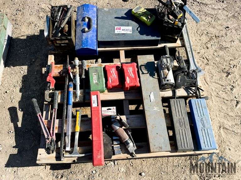 Pallet: HD Impact Sockets, HD Crescent, Torgue Wrench, Husky 4" Air Angle Grinder, Knock Out Punch Kit, Drill Bits, Matco Torgue Wrench, Pry Bars, Etc.