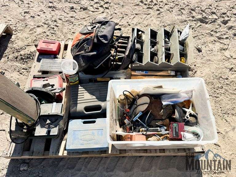Pallet: Central Machinery Belt & Disc Sander, Electric Solder Gun, Caliper, Tote w/Misc Leather Working Tools, Bits, Bag w/Misc Screw Drivers, Rivet Gun, Etc.