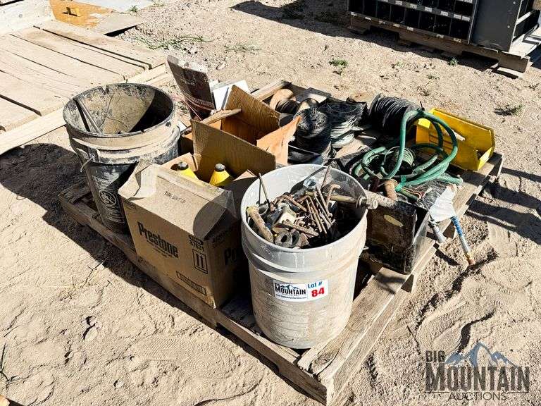 Pallet: Power Steering Fluid, Partial Parts Cleaner, Misc Wire, Misc Pins, (2) Buckets w/Bolts, Misc Nuts, Hyd Fittings