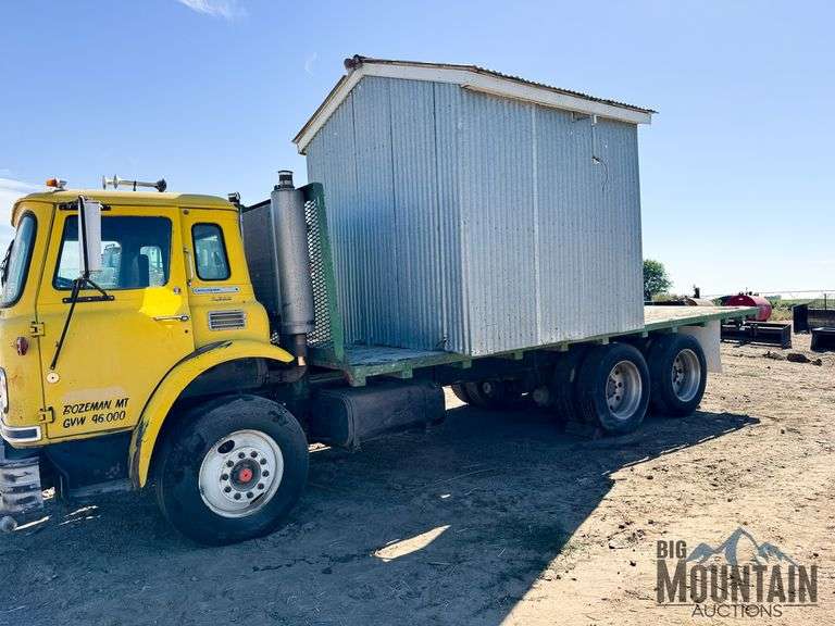 ***TITLED*** 1974 International Cargo Star 1950 B 10 Wheel Flat Bed Truck, Showing 241,463 Miles, Detroit 255 Hp Engine, Auto Transmission, Spring Suspension, 275/80R24.5 Tires, 21' x 102" Flat Bed, w/Small Wooden Metal Storage Building, (yellow), VIN:25795DCA18743