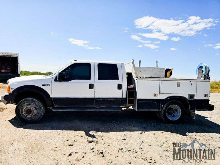 ***TITLED*** 1999 Ford F450 XLT 4x4 Crew Cab Dually Service Pickup, Showing 195,410 Miles, 7.3 Power Stroke Engine, Auto Trans, 225/70R19.5 Tires, Knapheide 6 Compartment Service Bed, 5' Toolbox, Dewalt Reel & Air Hose, Hose Reel w/Oxygen & Acetylene Hoses, NEW ENGINE AT 130 MILES, (white), VIN:1FDXW47F8XEB19342